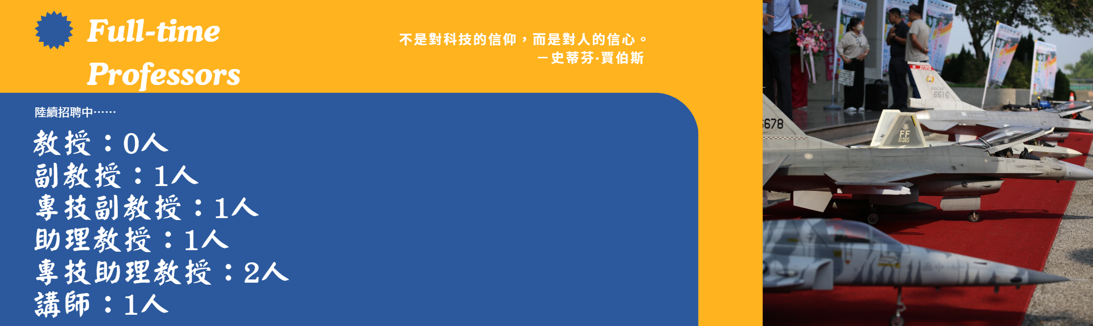 師資陣容 專任師資一覽 陳楊正光 副教授兼系主任最高學歷:英國克蘭菲爾 工業工程系統管理博士 個人專長:無人機操作、飛機製造與維修、工業工程管理 聯絡電話 : (05)2267125 #72201 電子信箱:yangerchen@wfu.edu.tw 研究室:花明樓 TB715 盧建銘 助理教授最高學歷:國立成功大學 工程科學博士 個人專長:積層製造(3D列印)、人工智慧(AI)、虛擬實境(AR, VR)、奈米材料模擬、科普教學與育才活動之推展 聯絡電話 : (05)2267125 #22215 電子信箱:jmlu@wfu.edu.tw 研究室:花明樓 TB522 湯士堅 專技副教授最高學歷:英國克蘭菲爾大學 應用科學院製造系統博士 個人專長:人工智慧、3D列印實務、AI應用、Python程式語言、微機電 聯絡電話 : (05)2267125 #22286 電子信箱:tsjmark@wfu.edu.tw 研究室:花明樓 TB524 毛駿騰 專技助理教授最高學歷:中信科技大學(原:遠東科技大學) 機械工程系碩士 個人專長:無人飛行載具設計、製作、維修與任務運用;無人機遙測與影像處理;飛機修護;自動控制。 聯絡電話 : (05)2267125 #22279 電子信箱:jasonmao@wfu.edu.tw 研究室:花明樓 TB517 鄭維誠 專技助理教授最高學歷:國立成功大學航空太空工程學系 碩士 個人專長:無人飛行載具性能分析、通訊導控設備設計研發、無人載具應用實務 聯絡電話 : (05)2267125 #72203 或 #22283 電子信箱:jackcheng@wfu.edu.tw 研究室:花明樓 TB521 江怡洋 講師最高學歷:逢甲大學資訊工程系 碩士 個人專長:人工智慧應用、Python 程式開發、影像辨識與空間資訊應用 聯絡電話 : (05)2267125 #72203 或 #22285 電子信箱:yiyang@wfu.edu.tw 研究室:花明樓 TB521 辦公室成員一覽 李冠褕 助理聯絡電話:(05)2267125 #72202 電子信箱:remind0226@wfu.edu.tw 辦公室:花明樓TA614